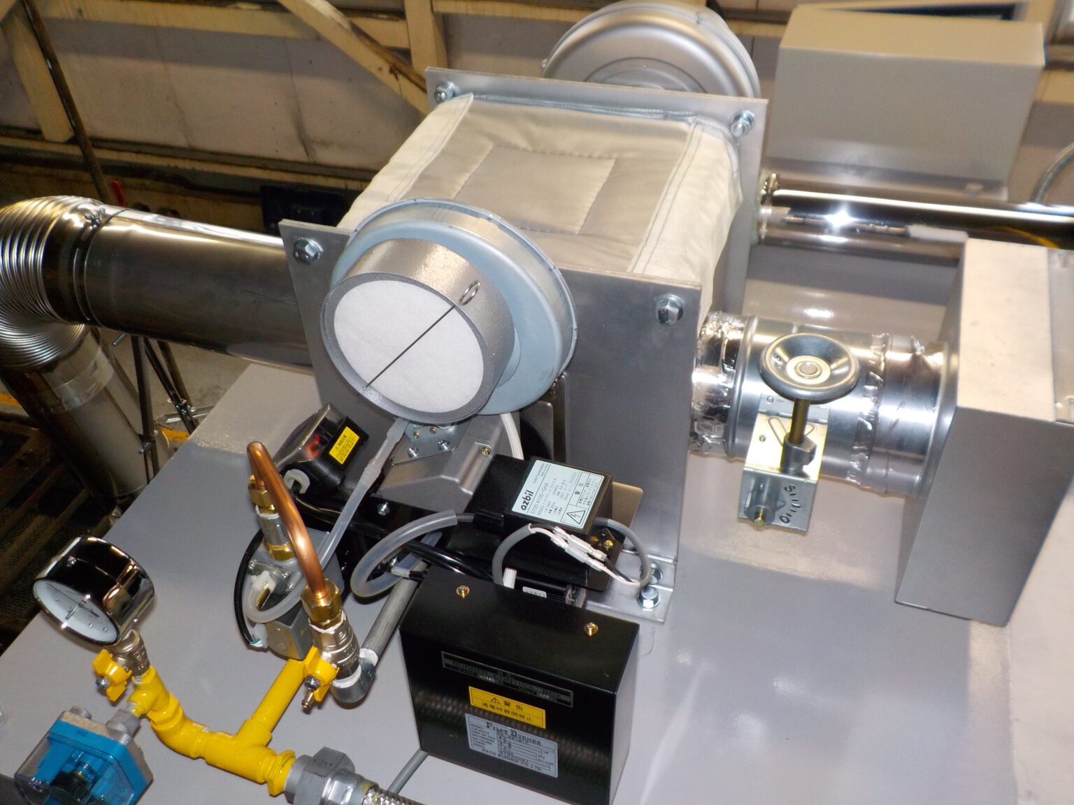 排気ダクト内の結露を防ぐための熱風発生装置で、従来品は熱風量・静圧共に低くてダクト内の温度が上がらず結露を防止できていませんでした。 高ターンダウンバーナー・高風圧型の熱風発生装置を設置してダクト内の温度を100°C以上に キープできるようになり結露を抑えることができました。