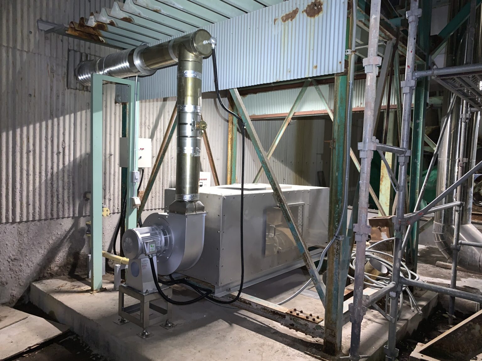 コンベアラインで搬送される砂を温めるための熱風発生装置で、これまで電気式の市販品を使用していましたが風量が少なく、あまり効果を発揮されていませんでした。 高風圧型に変更したことで乾燥効果は抜群となり、さらにランニングコストもダウンしました。